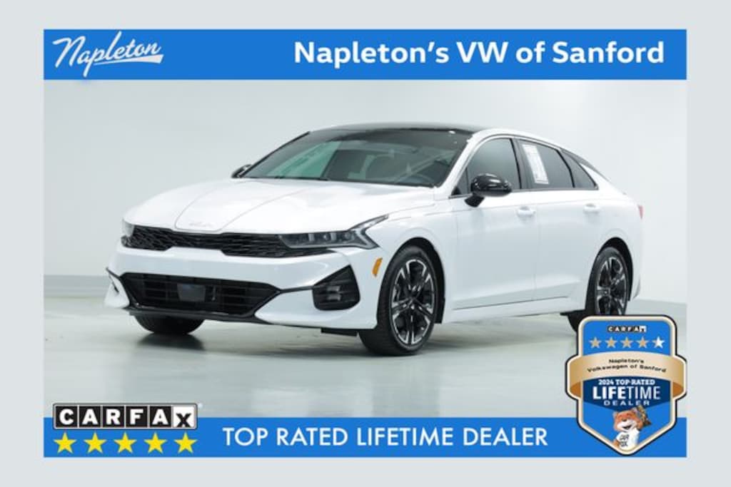 Certified by Carfax - One Owner, Backup Camera, Bluetooth Hands Free Calling, Alloy Wheels, Leather, Sunroof, K5 GT-Line, 4D Sedan, 1.6L I4 DGI Turbocharged DOHC 16V LEV3-ULEV70 180hp, 8-Speed Automatic, FWD, Glacial White Pearl, Black Cloth, Forward Collision Avoidance-Assist, Gloss Black Trim, GT-Line Panoramic Sunroof Package, GT-Line Premium Package, Highway Driving Assist, LED Interior Lighting, LED Projection Headlamps, Navigation System, Panoramic Sunroof, Smart Cruise Control w/Stop & Go.