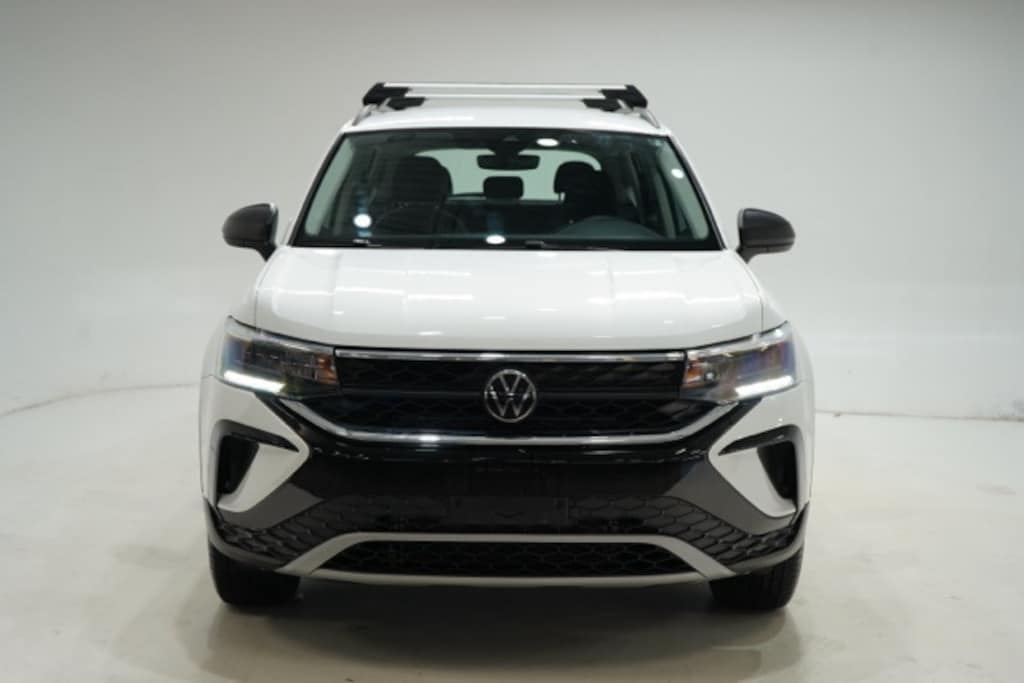 This Taos is well equipped with Taos Adventure Package (Black Bumperdillo Protection Plate for Rear Bumper, Roof Rack Base Carrier Bars (Set of 2), and Wheel Splash Guards (Set of 4)), 4-Wheel Disc Brakes, 5.20 Axle Ratio, 6 Speakers, ABS brakes, Active Blind Spot Monitor, Air Conditioning, Alloy wheels, AM/FM radio, Auto High-beam Headlights, Brake assist, Bumpers: body-color, Cloth Seating Surfaces, Compass, Delay-off headlights, Driver door bin, Driver vanity mirror, Dual front impact airbags, Dual front side impact airbags, Electronic Stability Control, Emergency communication system: VW Car-Net Safe & Secure 5-year, Exterior Parking Camera Rear, First Aid Kit, Four wheel independent suspension, Front anti-roll bar, Front Bucket Seats, Front Center Armrest, Front reading lights, Front Strut Rear Multi-Link Suspension, Fully automatic headlights, Heated door mirrors, Heated Front Bucket Seats, Heated front seats, Heated steering wheel, Illuminated entry, Leather Shift Knob, Low tire pressure warning, Occupant sensing airbag, Outside temperature display, Overhead airbag, Overhead console, Panic alarm, Passenger door bin, Passenger vanity mirror, Power door mirrors, Power steering, Power windows, Radio data system, Radio: Composition Color AM/FM, Rain sensing wipers, Rear anti-roll bar, Rear seat center armrest, Rear window defroster, Rear window wiper, Remote keyless entry, Rubber Mats Kit (SNM), Speed control, Speed-sensing steering, Split folding rear seat, Spoiler, Steering wheel mounted audio controls, Tachometer, Telescoping steering wheel, Tilt steering wheel, Traction control, Trip computer, Variably intermittent wipers, and Wheels: 18" 2-Tone Machined Alloy.